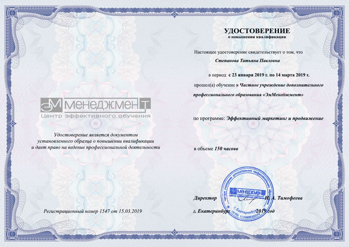 - Удостоверение о повышении квалификации – выдается после прохождения курсов продолжительностью больше 16 ак. часов и свидетельствует об освоении программы дополнительного образования по направлению "Маркетинг и интернет-продвижение".